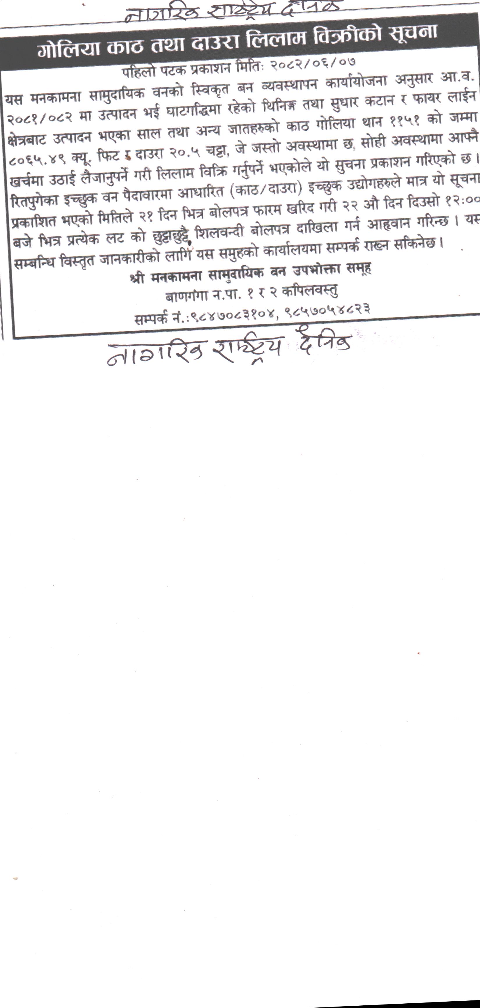मनकामना सामुदायिक वन उपभोक्ता समूह, वाणगंगा न.पा. १ र २ कपिलवस्तुको काठ दाउरा लिलाम बिक्रीको सूचना