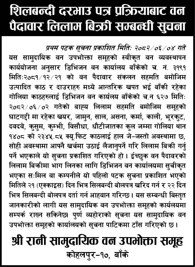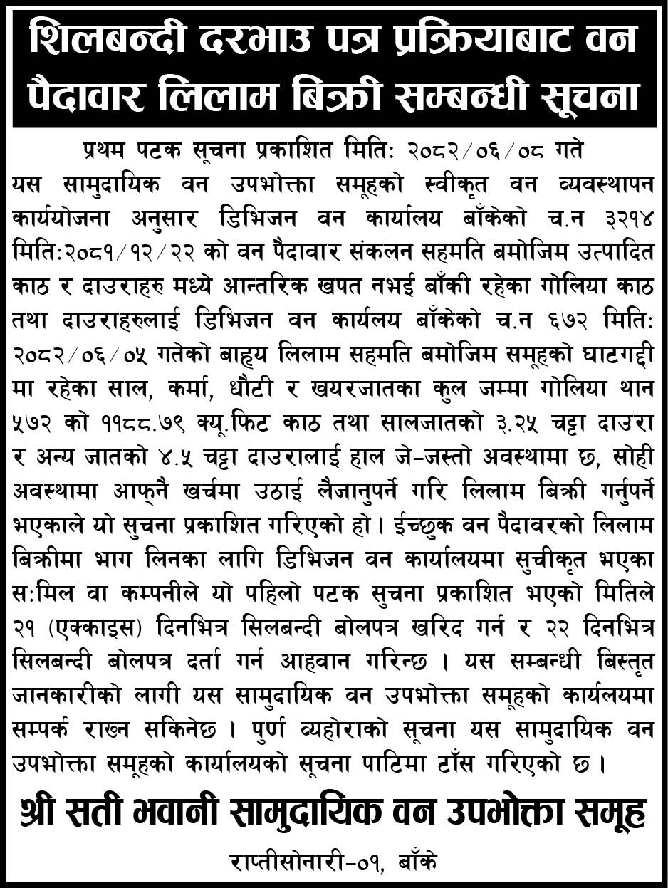 शिलबन्दी दरभाउ पत्र प्रक्रियाबाट वन पैदावार लिलाम विक्री सम्बन्धी सूचना (सती भवानी सा.व.उ.स, बाँके) २०८२।०६।०८
