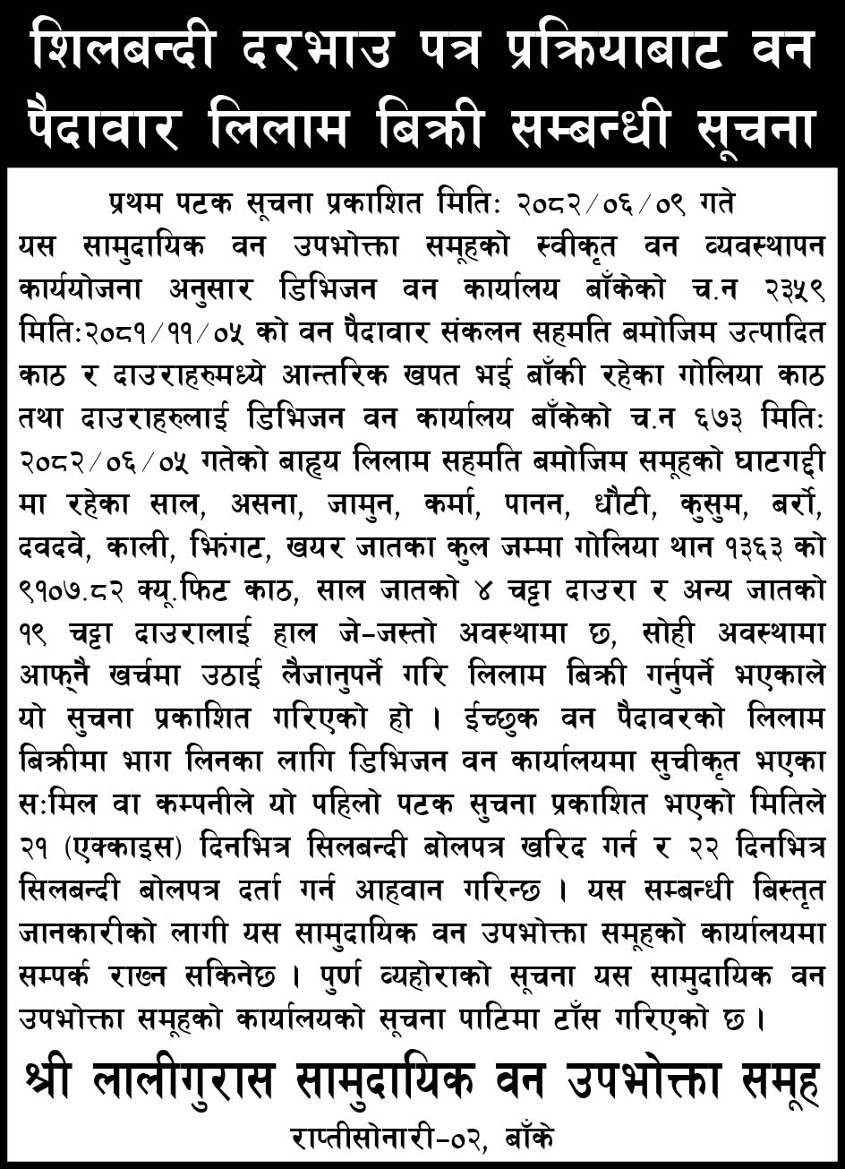शिलबन्दी दरभाउ पत्र प्रक्रियाबाट वन पैदावार लिलाम विक्री सम्बन्धी सूचना (लालीगुरास सा.व.उ.स, बाँके) २०८२।०६।०९
