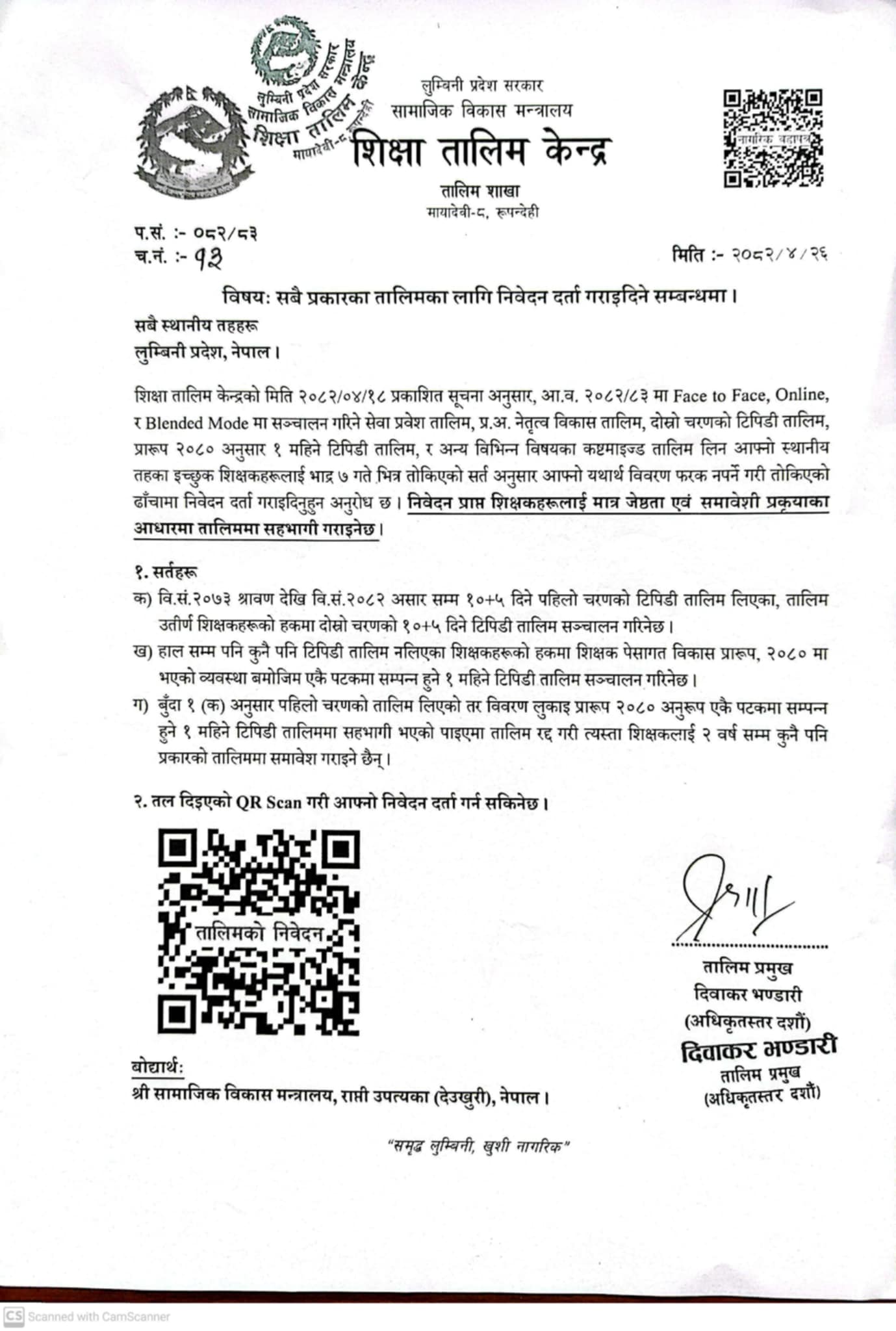 तालिमको फारम भराइदिनुहुन बारे सबै स्थानीय तहहरूलाई सूचना