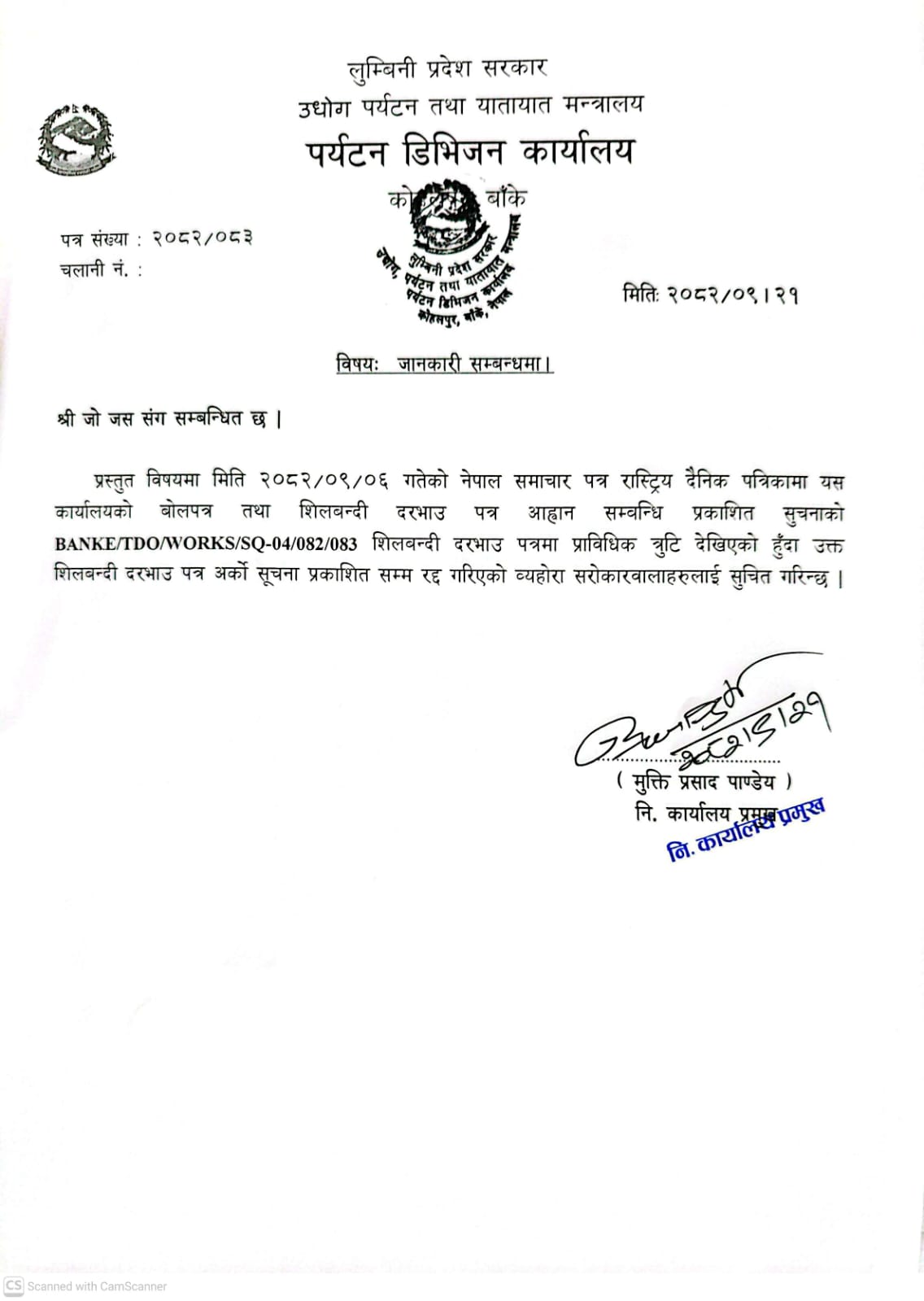 | पुस २१, २०८२, सोमबार | पर्यटन डिभिजन कार्यालय कोहलपुर , बाँके | सूचना रद्द गरिएको सम्बन्धमा | ||